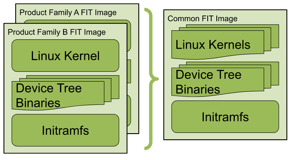 From the above image you might have noticed that the kernel and associated binaries are being stored in a FIT Image. This stands for Flattened uImage Tree (FIT), and is basically a container for all the kernel components. This FIT type is designed for this use case and includes configuration nodes that define valid combinations to boot from; all the bootloader has to do is specify which product configuration to boot with. FIT images are not strictly necessary for this, the bootloader could just pick a device tree and pass it to the kernel, but generally FIT images are the right tool to use here (and come with a plethora of other advantages).