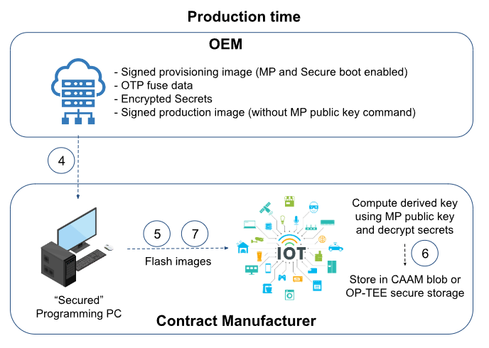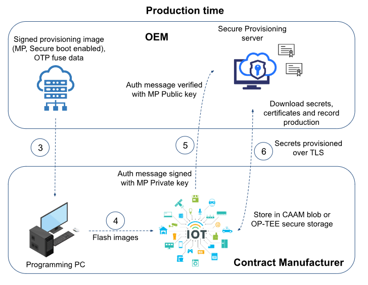 - OEM creates a signed provisioning image with MP and Secure boot enabled along with fuse configuration (SRK hashes etc.), encrypted secrets and final production image.